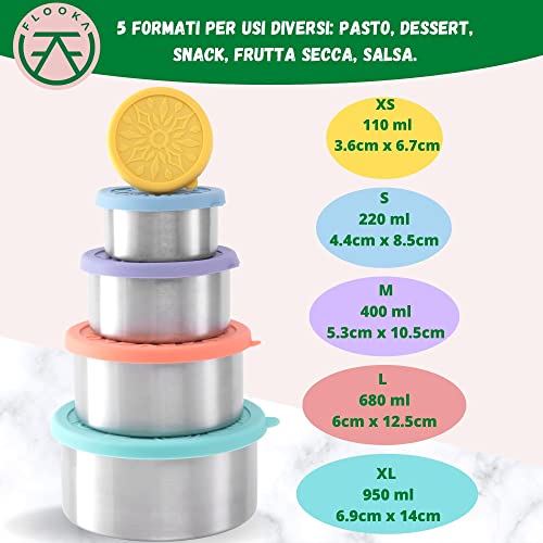 USI DIVERSI: è possibile utilizzare i contenitori alimentari Flooka anche come: lunch box, insalatiera, piatti per il campeggio, snack per bambini. Puoi riscaldare i tuoi piatti nel forno. Come tutte le stoviglie in acciaio, è sconsigliato metterle nel forno a microonde.