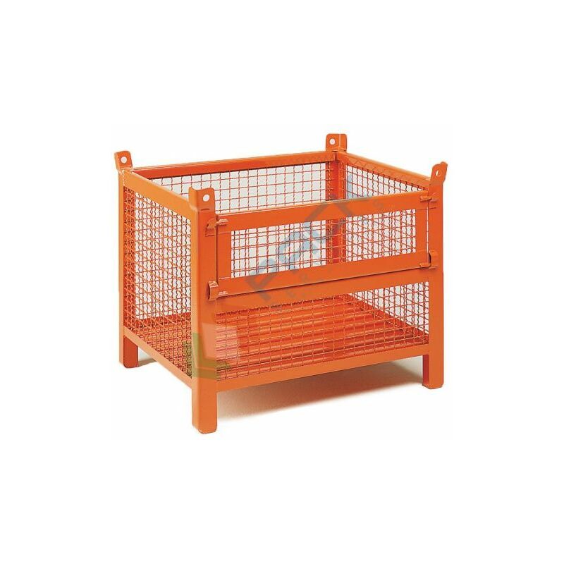 Cassone in ferro in rete metallica 4 piedi, mis. 1200 L x 1000 P x 780/845 H mm, portata 800 Kg, porta apribile sul lato lungo. La verniciatura viene realizzata con polvere poliestere per esterno a forno 190°. Colore arancione RAL 2004. Contenitore metallico con 4 piedi ideale per il trasporto e stoccaggio di materiale sfusi e per la raccolta di rifiuti industriali presso industrie e magazzini. Super robusto e resistente. I nostri contenitori in lamiera garantiscono la massima facilità di utilizzo ed aumentano la produttività all'interno dell'impresa. Cassoni in metallo in rete 4 piedi con pareti e fondo realizzati con una lamiera particolarmente pesante, che assicura una perfetta funzionalità e resa del contenitore stesso anche nelle condizioni di utilizzo più critiche. La loro struttura robusta consente di sopportare carichi di materiali medio / leggeri. Le ceste metalliche industriali sono impilabili, caratteristica molto importante a magazzino perchè consente di ridurre gli spazi