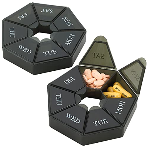 CONFEZIONE DA 2 ORGANIZZATORI PER PILLOLE SETTIMANALI: Con 7 scomparti e un design rotondo circolare, questo organizer per pillole settimanale è più compatto e più facile da usare. Ogni scomparto è autonomo con il proprio coperchio ed etichettato con il giorno della settimana. Le etichette stampate chiare e di grandi dimensioni ti aiutano a monitorare quali farmaci hai già assunto prevenendo dosaggi mancati. L'etichetta non si sbiadirà facilmente e durerà per una lunga durata di utilizzo