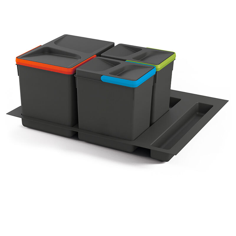 I contenitori per cassetti Recycle di Emuca facilitano la raccolta differenziata dei rifiut i in modo discreto e ordinato, in quanto integrati nei mobili della cucina. Disponibili per moduli di 60 cm e 90 cm di larghezza e con due diverse altezze di contenitori, che consentono di avere diverse configurazioni con una capacit� utile da 24 litri a 44 litri. Le basi sono ritagliabili per adattarsi perfettamente allo spazio vuoto utile del cassetto in cui � installato, mentre i secchi dispongono di maniglie di diversi colori per facilitare sia l'identificazione dei rifiuti che contengono sia la loro estrazione per lo svuotamento e la pulizia. Contenitori di altezza 216 mm con base per cassetto di modulo 600 mm. Il set include un secchio da 12 litri di capacit� e 2 secchi da 6 litri. Fabbricati in plastica grigio antracite. Base con alette estraibili per poterla adattare alle dimensioni interne del cassetto. I contenitori hanno una maniglia colorata per facilitare la classificazione dei