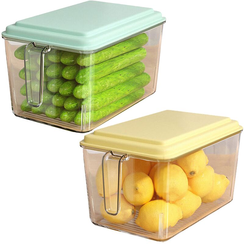 Conservazione degli alimenti con coperchi colorati. Robusti e durevoli: realizzati in materiale addensato con un'eccellente resistenza alle basse temperature, adatti all'uso prolungato in frigorifero, atossici e inodori. L'elevata trasparenza consente di trovare facilmente i prodotti desiderati. Contenitori per la conservazione degli alimenti: il kit comprende 2 organizer da frigorifero, che possono contenere facilmente una grande quantità di prodotti. Design impilabile a doppia fibbia: i contenitori per prodotti da frigorifero impilabili consentono di ottimizzare lo spazio e di mantenere gli articoli organizzati e facili da trovare. NOTA BENE: Temperatura di utilizzo -20°C~80°C. Non adatto a microonde, forno o lavastoviglie.