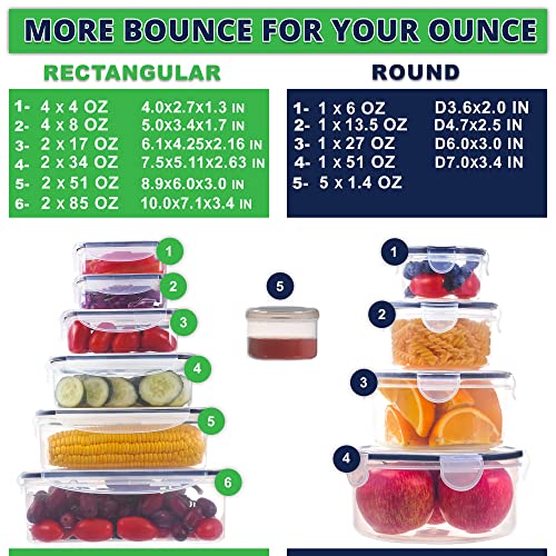 Varietà con maggiore capacità: contenitori di grandi dimensioni perfetti per portata principale, 25 contenitori con 25 coperchi di dimensioni variabili che si adattano perfettamente a diverse varietà di antipasti e avanzi. Adatto per occasioni come portare il pranzo a scuola, ufficio, picnic o eventi o conservare tutti i giorni cibi non mangiati. Questo set include 16 contenitori rettangolari (2 x 9 oz, 2 x 55 oz, 2 x 765 ml, 2 x 382 oz, 4 x 8 oz, 4 contenitori rotondi (1 x 55 oz, 1 x 35 oz, 1 x 30 oz, 1 x 3 oz, 1 x 3 oz. 82.7 g, 1 x 6 once) e 5 scatole di salsa piccole (5 x 39,7 g).