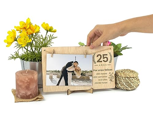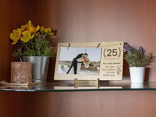 Cornice fotografica originale 25 anni: regalo di auguri diverso e originale in legno per giovani di 25 anni e anniversari o matrimoni in argento per coppie che sono sposate da 25 anni. Questo portafoto in legno è realizzato in legno naturale e può essere personalizzato scrivendo belle frasi, dedica e firme sul retro.