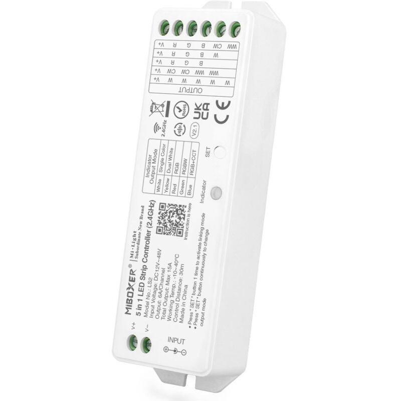 Questo controller da 5 in 1 consente di controllare i punti LED o i nastri LED. La gamma superiore era dotata di 5 diverse modalità di colore: monocolore / RGB / CCT / RGBW / RGB+CCT. Funziona in 12-48V. Corrente nominale: 6A/canale. Controller RF: 2.4GHz. Ambito: 30m. Ha una trasmissione ad alto segnale, anti-interferenza. Saturazione e intensità luminosa regolabile. Sono disponibili diverse modalità di sincronizzazione. Può anche essere controllato dal suo smartphone: Alexa / Google Assistant e il trasmettitore LED DMX512. Compatibile con: FUT089 / FUT088 / FUT092 / FUT096 / FUTB8 / FUTBILE / FUTB1 / FUTTO / FUTTO / FUTB: / FUTB3 / FUTTO / FUTB4 / FUTT4 / FUTK1 / FUT087 / FUTS2-B / FUTS2-W / FUTS2-G. Dimensioni: altezza: 38mm, lunghezza: 125mm, larghezza: 23mm. Garanzia 2 anni. Il controller 5 in 1 è un dispositivo all'avanguardia che offre il controllo totale sui punti LED o nastri LED. È uno strumento di fascia alta con cinque diverse modalità di colore: monocolore, RGB, CCT, RGBW