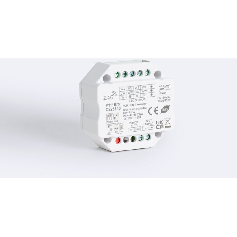 Scopri il Controller Regolatore LED di ultima generazione da 12/24V DC per Striscia LED CCT/RGB/RGBW, compatibile con Telecomando RF, una soluzione avanzata che utilizza la tecnologia wireless a 2,4 GHz per una gestione efficiente dell'illuminazione. Questo dispositivo è stato progettato appositamente per gestire strisce LED Monocolore, CCT o RGB o RGBW, consentendo una regolazione precisa della luminosità e del colore tramite telecomando, per creare ambienti personalizzati adatti a ogni occasione o preferenza. Dettagli del Controller Regolatore LED 12/24V DC per Striscia LED Monocolore/CCT/RGB/RGB/RGBW compatibile con Pulsante e Telecomando RF Grazie al suo design innovativo e compatto, con un profilo di soli 26 mm di spessore, questo regolatore è facilmente installabile in qualsiasi spazio, indipendentemente dai vincoli. Utilizzando il Telecomando RF disponibile tra gli accessori, è possibile sincronizzare più unità a una distanza massima di 30 metri in aree aperte, consentendo il