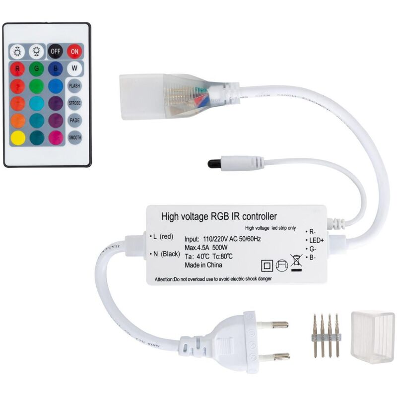 Controller progettato per Striscia LED Neon 11 W/m RGB 220V AC 60 LED/m Semicircolare 180° IP67 Su Misura Taglio ogni 100 cm con telecomando IR (Infrarossi) con 24 pulsanti e 6 metri di portata, con cui è possibile gestire a distanza i canali RGB in modo efficiente. Con questo controller è possibile selezionare il colore e l'effetto desiderato e regolare l'intensità e la velocità delle transizioni. Modalità di funzionamento: -Accensione della luce. -Spegnimento della luce. -Luce fissa di uno qualsiasi dei 16 colori disponibili (vedi foto telecomando). -Aumento dell'intensità luminosa. -Riduzione dell'intensità luminosa. -Modalità FLASH: Modifica del colore della luce (passa attraverso l'intera gamma di colori). -Modalità STROBE: Luce intermittente (rimane accesa per 4 secondi e si spegne per 4 secondi). -Modalità FADE: Cambiamento graduale e progressivo del colore della luce (passa attraverso l'intera gamma di colori, partendo sempre dal rosso). -Modalità SMOOTH: Modifica del colore