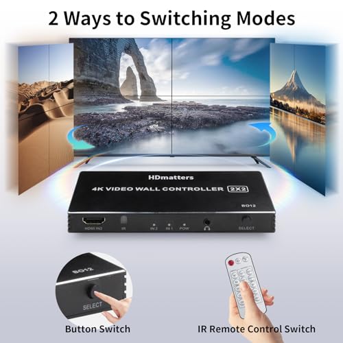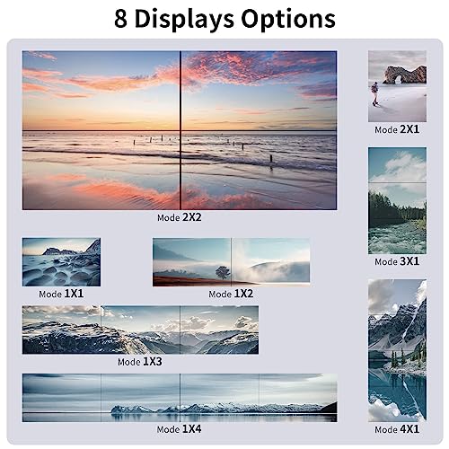 【8 modalità di visualizzazione regolabili】Questo processore video HDMI 2x2 può collegare fino a 4 TV LCD o altri display, che possono supportare molteplici modalità di visualizzazione, come ad esempio 2x2, 1x1, 1x2, 1x3, 1x4, 4x1, 3x1, 2x1. Tutte queste modalità forniscono una varietà di opzioni di splicing e possono facilmente passare dalle modalità tramite il telecomando IR.