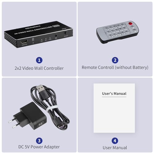 Controller Video Wall 2x2 4K, Processore Video Wall HDMI con rotazione di 180 Gradi Giunzione Dello Schermo 1080P, 1x2 1x4 1x3 2x1 3x1 4x1 Schermo Immagine Multi Video