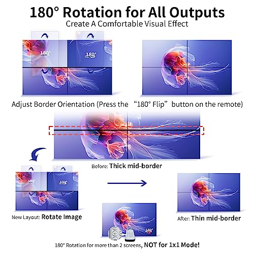 【Rotazione dello schermo a 180°】Con la funzione di rotazione, puoi capovolgere l'immagine di tutte le uscite HDMI di 180 gradi, che può regolare gli schermi in un'orientamento con i bordi più sottili e ridurre il bordo centrale spesso. La funzione di maschera dei bordi può correggere e allineare i bordi della cornice e dell'immagine, rendendo i multipli schermi più confortevoli.