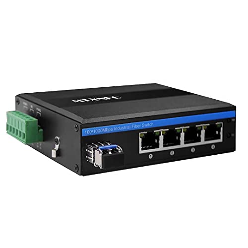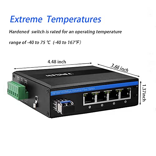 Che cosa otterrete. 1 x Mini (4,48 x 3,66 x 3,66 x 3,37 pollici), commutatore a binario DIN gigabit industriale, indurito a 5 porte, con trasmettitore SFP e un manuale di utilizzo;