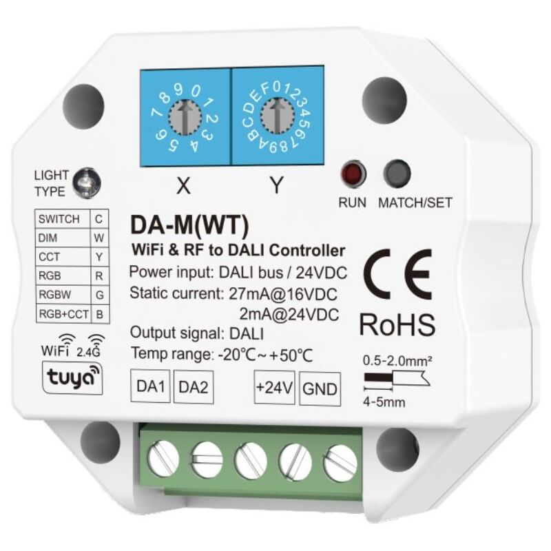 Il Convertitore da RF/Wi-Fi a DALI compatibile con Telecomando, Tuya Wi-Fi e Hue è un convertitore 6 in 1 in grado di convertire un segnale RF/Wi-Fi in un segnale digitale DALI . Offre una varietà di funzioni tra cui controllo del colore singolo, temperatura del colore, RGB, RGBW, RGB+CCT e controllo on/off. Può essere controllato da remoto utilizzando un controllo dimmer, utilizzando l'app Tuya o utilizzando l'app HUE. Grazie a queste applicazioni potrai regolare la temperatura del colore, l'intensità e altre funzioni avanzate, come la programmazione dei timer e la modifica delle scene. Il convertitore è conforme allo standard del protocollo DALI IEC 62386-101, 102, 207, 208, 209 ed è compatibile con i prodotti DALI di altre società internazionali, garantendone l'interoperabilità. Può essere alimentato tramite il bus DALI o un alimentatore da 24 V CC e consente la selezione dell'indirizzo DALI tramite un interruttore di codifica, semplificandone la configurazione e l'utilizzo. Con