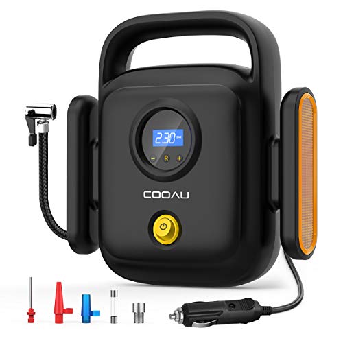 COOAU Compressore Aria Portatile 12V, Pompa Elettrica Ricaricabile 150 PSI (10 Bar) con Schermo LCD Digitale e Luce LED Emergenza, 3 Adattatori di Valvola per Pneumatici di Auto, Moto, Biciclette