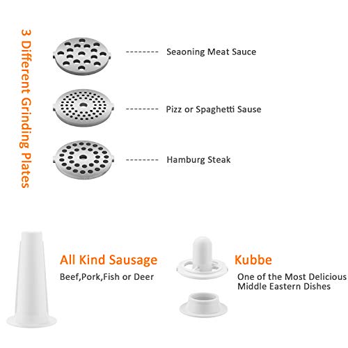 【Accessori pratici】 Tritacarne Dotato di 1 lama di taglio, 1 accessorio per salsiccia, 1 spingitore alimentare, 1 accessorio Kubbe, 1 piastra tramoggia. tritaverdure elettrico Soddisfa anche le tue esigenze quotidiane per la preparazione di zuppe, pappe, gustose polpette di carne, sformati, ecc.