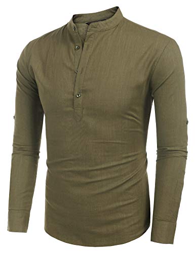COOFANDY Maglietta da uomo in cotone lino Henley Casual Hippie Beach T-shirt a maniche lunghe, verde militare, L