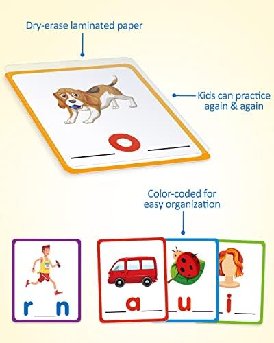 CVC Word Writing Card: 114 pezzi di carte di parole CVC sono separati in due livelli da colori, con 4 pennarelli cancellabili a secco che sono lavabili per un uso ripetuto. La confezione viene fornita con una borsa portatile per una facile conservazione.