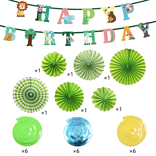 Un totale di 25 decorazioni di compleanno, tra cui 1 confezione di striscioni con animali, 6 ventagli di fiori di carta, 18 decorazioni di ghirlande a spirale, facili da usare e facili da montare.