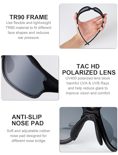 [Lenti polarizzate premium e materiale TAC] Realizzati in materiale TAC premium, questi occhiali da ciclismo garantiscono protezione UV400 al e antiriflesso e possono eliminare efficacemente la luce riflettente e il bagliore e ridurre il dolore agli occhi, rendendo lo scenario più chiaro e morbido.