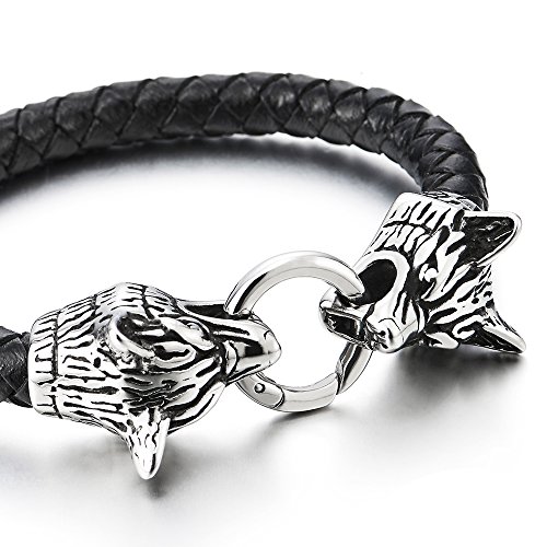 COOLSTEELANDBEYOND Annata Acciaio Inossidabile Testa di Lupo, Uomo Bracciale, Braccialetto di Pelle Intrecciata, Vera Pelle Nero
