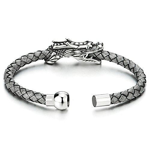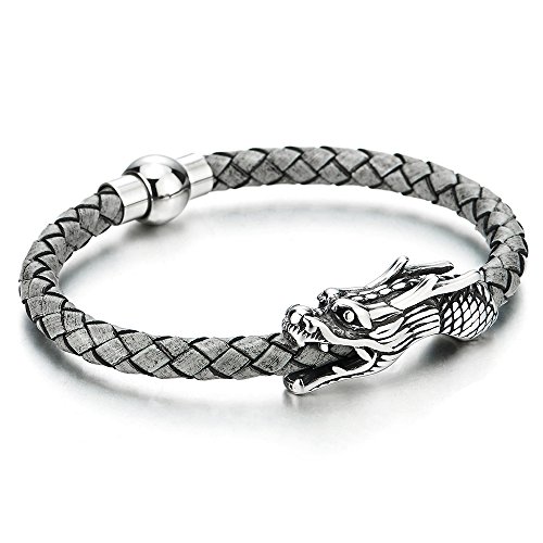 COOLSTEELANDBEYOND Annata Bracciale Drago Acciaio, Uomo Ragazzi Braccialetto di Grigio Pelle Intrecciata, Fascia di Polso Vera Pelle