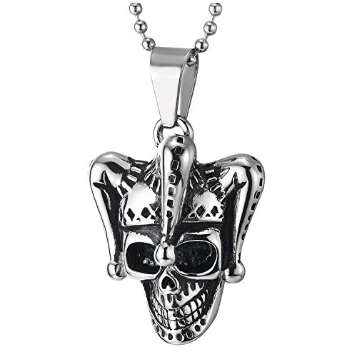 COOLSTEELANDBEYOND Annata Clown Fantasia Teschio Ciondolo, Cranio Collana con Pendente da Uomo Donna, Gotico, Acciaio, Palla Catena 75cm