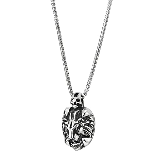 COOLSTEELANDBEYOND Collana con Pendente da Uomo, Ciondolo Cranio Leone Testa, Acciaio Inossidabile, Biker, Tribal, 60CM Catena del Grano