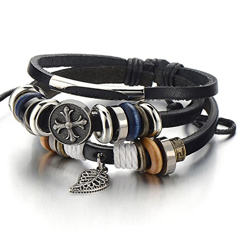 COOLSTEELANDBEYOND Etnico Tribale Foglia Croce, Multi-Filo, Uomo Donna Braccialetto Cuoio Fascia di Polso, Pelle Bracciali Avvolgere