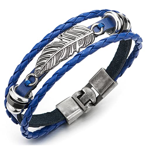 COOLSTEELANDBEYOND Tre File Annata Foglia Piuma Braccialetto, Uomo Donna Bracciali Blu Intrecciato Cuoio, Fascia di Polso