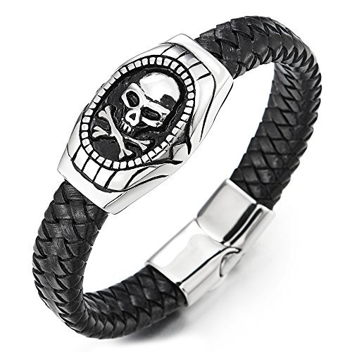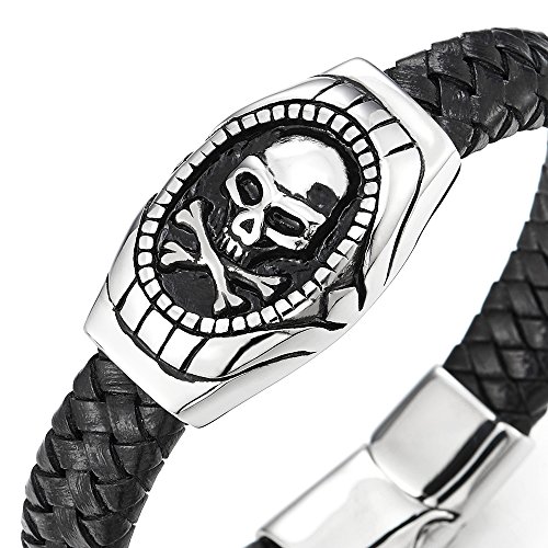COOLSTEELANDBEYOND Gotico, Acciaio Braccialetto Pirata Cranio Teschio ID Identificazione Bracciale da Uomo, Nero Pelle Intrecciata, Biker