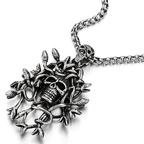 COOLSTEELANDBEYOND Medusa Serpente Cranio, Ciondolo Teschi, Collana con Pendente da Uomo Donna, Acciaio Inossidabile, Catena Grano 75CM
