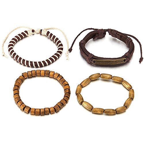 COOLSTEELANDBEYOND Mescolare di 4 Marrone Bracciali Avvolgere Uomo Donna, Perline Legno Braccialetto, Pelle Fascia di Polso Etnico Tribale