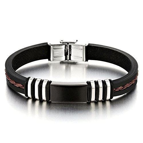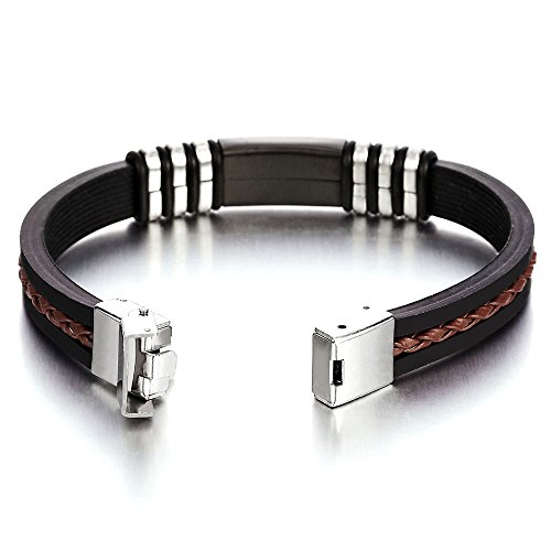 COOLSTEELANDBEYOND Nero Silicone Acciaio ID Identificazione Braccialetto da Uomo Ragazzi, Fascia di Polso, con Marrone Pelle Intrecciata