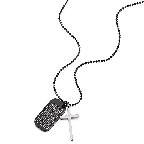 COOLSTEELANDBEYOND Due Pezzi Ciondolo Bibbia Croce Nero Argento, Collana con Pendente da Uomo Donna, Dogtag, Acciaio, Palla Catena 60CM