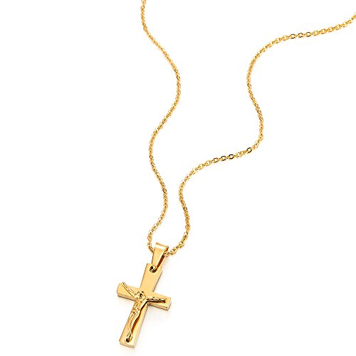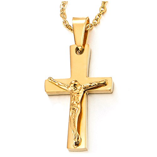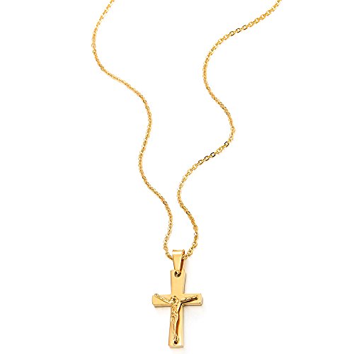 COOLSTEELANDBEYOND Piccolo Colore Oro Crocifisso Croce, Gesu Cristo, Collana Pendente Uomo Donna, Ciondolo Acciaio, 50CM Corda Catena