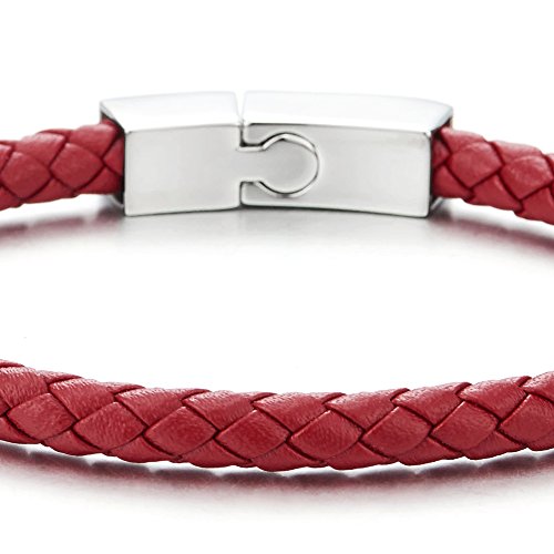 COOLSTEELANDBEYOND Sottile Braccialetto di Rosso Pelle Intrecciata da Uomo Donna, Bracciale Fascia di Polso, Acciaio Chiusura Magnetica