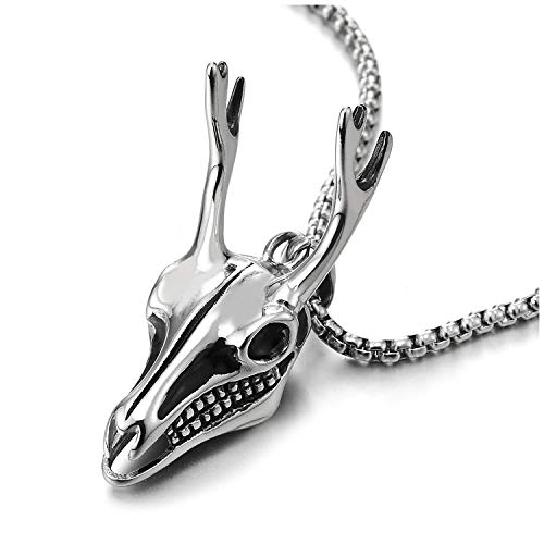 COOLSTEELANDBEYOND Testa Cranio Scheletro Corno Cervo Renna Ciondolo, Collana Pendente Uomo Donna, Acciaio, Catena del Grano 75CM