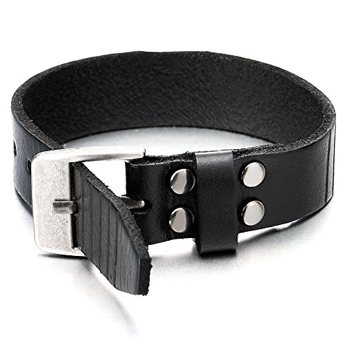 COOLSTEELANDBEYOND Unico Nero Strisce Braccialetto di Cuoio, Uomo Ragazzi Bracciale Vera Pelle Fascia di Polso