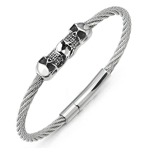 COOLSTEELANDBEYOND Unico Sottile Bracciale del Cranio Teschio, Uomo Donna Braccialetto del Polsino, Acciaio Inossidabile, Cavo Intrecciato