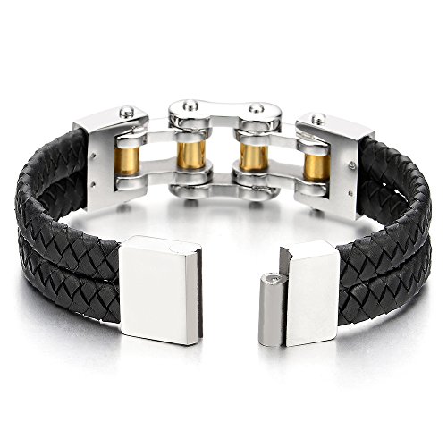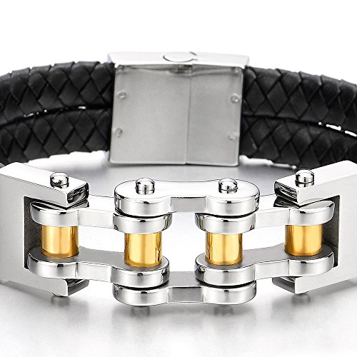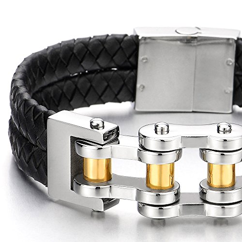 COOLSTEELANDBEYOND Uomo Acciaio Bracciale Argento Oro Catena di Bicicletta Moto Motociclo, Braccialetto di Nero Pelle Cuoio Intrecciata