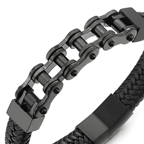 COOLSTEELANDBEYOND Uomo Acciaio Bracciale Nero Catena di Bicicletta Moto Motociclo, Braccialetto di Nero Pelle Cuoio Intrecciata