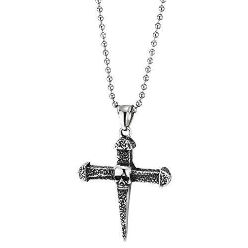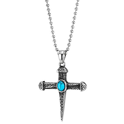 COOLSTEELANDBEYOND Uomo Annata Texture Chiodi Spillo Croce Ciondolo Cranio e Resina Turchese, Collana con Pendente Teschio Acciaio Due Lati