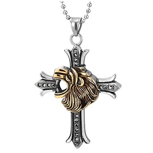 COOLSTEELANDBEYOND Uomo Donna Argento Nero Oro Annata Testa di Leone Croce Ciondolo, Collana con Pendente con Zirconi, Acciaio, Catena 75CM