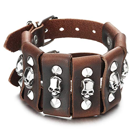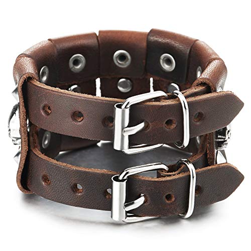 COOLSTEELANDBEYOND Uomo Donna Braccialetto di Rivetti Largo Marrone Cuoio, Uomo Bracciale del Cranio Teschio, Due Fibbia Chiusura