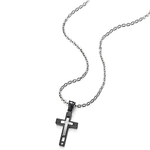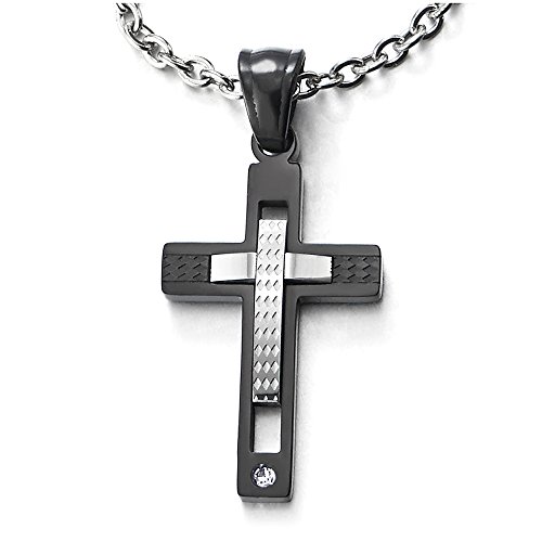 COOLSTEELANDBEYOND Uomo Donna Nero Argento Piccolo Intarsiato Croce Ciondolo con Zirconi, Collana con Pendente, Acciaio, Catena 51CM