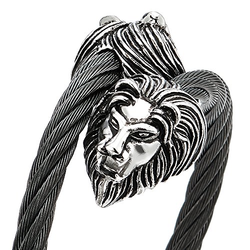 COOLSTEELANDBEYOND Uomo Elastico Regolabile Nero Bracciale con Annata Testa di Leone, Braccialetto Polsino, Acciaio Cavo Intrecciato