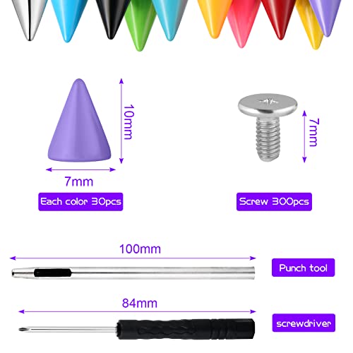 【Facile da usare】300 set di borchie e viti colorate con punte a cono con un punzone e un cacciavite. Basta praticare un piccolo foro, fissare la punta con un cacciavite e quindi serrare la vite del rivetto punk.