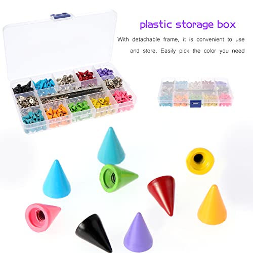 【Dimensioni, colore e confezione】7 * 10 mm/0,27 * 0,39 pollici (7 mm di diametro x 10 mm (3/8") di altezza). 10 colori: nero, blu, argento, rosso, viola, azzurro, arancione, verde, giallo, il rosa è classificato in una scatola di immagazzinaggio trasparente.Totale 300 set di borchie colorate con punte a cono per soddisfare le tue esigenze per diversi usi di progetti fai-da-te.