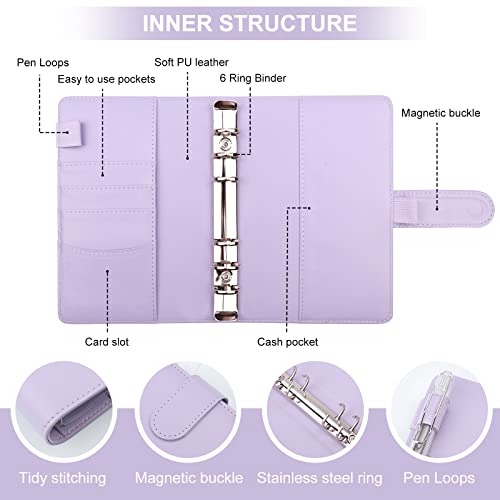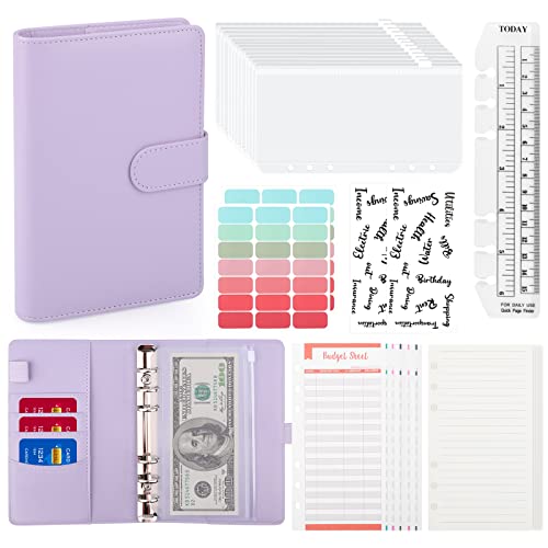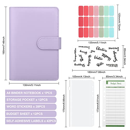 Coolzon Raccoglitore Notebook A6, Raccoglitore ad 6 Anelli con 12 Buste Trasparenti,12 Fogli di Budget, Adesivi ed Etichette Abbinati, 10 Supplementi di Budget,Budget di Contanti Organizzatore,Viola