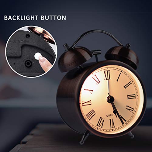 Coolzon Sveglia da Comodino Vintage, Classico Sveglia a Doppia Campana di Quarzo Analogico Sveglia Senza Ticchettio Sveglia Forte con Luce Notturna,3 "Numeri Romani