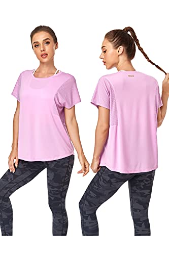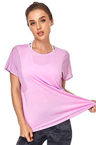 COOTRY Maglietta sportiva da donna a maniche corte con rete Loose Fit, traspirante, casual, yoga, palestra, allenamento Lilla L
