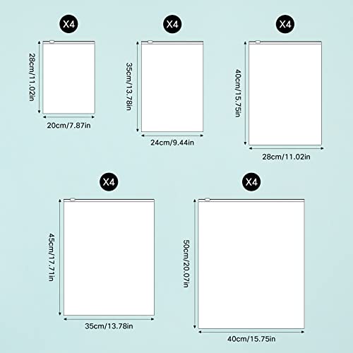 Miscelazione di 5 formati - Confezione da 24 sacchetti di plastica con chiusura a zip in 5 diversi formati: 50 X 40 cm, 45 X 35 cm, 40 X 28 cm, 35 X 24 cm, 28 X 20 cm (4 PC per dimensione). Dimensioni diverse per indumenti o forniture diverse, per tenere in ordine e risparmiare spazio.